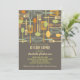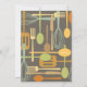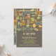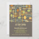 Retro style implements for cooking and eating are featured on this lovely invitation to a "stock the kitchen" Bridal Shower for the bride-to-be. The colour scheme is fun and neutral with forks, spoons, knives, spatulas and whisks in shades of umber, gold, brown and sage green, set against a pretty mocha brown background.