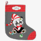 A black and white panda bear wears a red and white stocking cap and holds a candy cane on the front of this cute stocking. A few red, blue, and green tree bulbs lie scattered about the bear. He wears a red polkadot bow tie, which matches the toe and top border. On the top border is a white label with your custom text, which matches the background colour of grey. The back of the stocking has the same polkadot pattern. Cute for either a boy or girl!