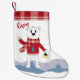 A red and white Christmas stocking with a cartoon polar bear holding a light in one hand and waving with the other . It also has a trompe l'oeil plaid border . Personalise it with a name .