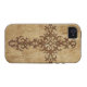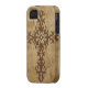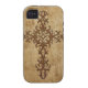 A stone Gothic cross design sits on a stone background. The intricate tribal lines and points give this cross an aggressive look. The rough textures and natural brown and yellow colors give the pattern the look and feel of an ancient artifact. Cracks in the granite give the iphone4 the look of being carved out of solid rock. This stylish design is a striking representation of this spiritual symbol.