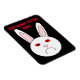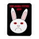 This awesome magnet features the sad face of a white rabbit. This rabbit has a big frown on its face because it is a lab rabbit that has had cosmetics tested on it. The whites of its eyes are red and swollen. The design has been created to bring to attention the unnecessary suffering caused by the testing of cosmetics on animals.