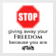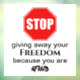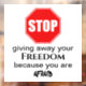 This design has a red stop sign. Along with the saying to stop giving away your freedom, because you are afraid in black writing on a white background.