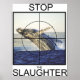 A photo of a breaching whale with the words Stop the Slaughter surrounding it. Killing whales is unnecessary and needs to be stopped before it's too late. Get the message out by wearing this shirt.