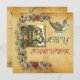 Elegant antique mediaeval parchment,funny vintage style floral design with a baby and flying stork among the beautiful pink,gold,red roses, spring flowers and green leaves by Bulgan Lumini (c).