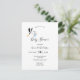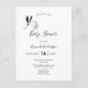 A simple cute baby shower invitation card celebrating a baby boy. A stylish white background, black letters. With a flying stork holding a baby boy. Personalise and add the name of the mum-to-be and your party details.