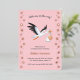 A stork is carrying a baby in a bundle. The baby is taking a selfie using a cellphone. Lovely and original baby shower invitation.