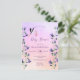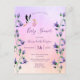 An elegant floral and garden themed baby shower invitation card. A romantic violet, pink and rose gold gradient background, purple letters. With pretty blue and violet watercolored bluebells flowers, florals. With a flying stork holding a baby girl. Personalise and add the name of the mum-to-be and your party details.