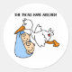 A stork carries a blue baby blanket with twin boys and text reads "The Twins Have Arrived!" on new twin boys items!