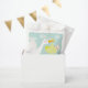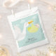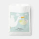 A cute white stork carries a baby in a yellow bundle through the sky, perfect for unisex or gender neutral baby shower party favour bags. MATCHING invitations, plates, napkins, stickers and more.