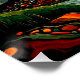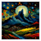 A.I .created print of surreal storm clouds illuminated as they roll across a celestial night sky of stars, moon and planets above a landscape of vibrant mountains and rolling hills