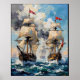 This dynamic painting depicts two large sailing ships navigating a stormy sea. The artwork is chraacterised by its heavy impasto texture, with thick, expressive brushstrokes that capture the churning, foamy waves and the turbulent clouds. Both ships, with their red flags and full sails, are shown in motion, creating a sense of drama and a historic maritime feel. The dark, cloudy sky and rough ocean add to the intense and adventurous atmosphere of the scene.