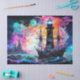 Sailboat light house in stormy seas under a full Moon and a colourful abstract skies