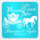 Fairy tale horse and carriage design, "happily ever after" with couple's name and date design in tropical aqua blue.