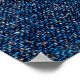 Straight stitch with orange thread on bleached denim fabric with fringe edge, on blue denim background, text place, copy space. Denim blue jeans fabric frame. Worn Jeans Casual Double Colour patch