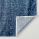 Straight stitch with orange thread on bleached denim fabric with fringe edge, on blue denim background, text place, copy space. Denim blue jeans fabric frame. Worn Jeans Casual Double Colour patch