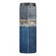 Straight stitch with orange thread on bleached denim fabric with fringe edge, on blue denim background, text place, copy space. Denim blue jeans fabric frame. Worn Jeans Casual Double Colour patch