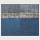 Straight stitch with orange thread on bleached denim fabric with fringe edge, on blue denim background, text place, copy space. Denim blue jeans fabric frame. Worn Jeans Casual Double Colour patch