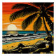 A.I .created contemporary interpretation of a lone figure is reclining under the shade of a palm tree, gazing out at a scenic beach sunset where he has been stranded due to a shipwreck. The sky is streaked with vibrant shades of orange and red, and the calm sea reflects the sun as it meets the horizon with a solitary sailboat in the distance.
