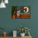A beautiful vintage Halloween poster featuring a child watching a flying witch through the window.