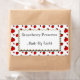 A custom canning or soap label with custom block letters on top and script letters on the bottom, with a retro background pattern of red strawberries. Click Customise It to change fonts, sizing and more, even save your design for later.