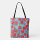 A bright and colourful tote bag decorated with a honey bees, flowers and a harvest of strawberries and blueberries drawn in pen and ink and painted with watercolor with a sky blue background. Fun tote for farmer's markets or a great gift for a gardener! The design is from my colouring book called "Lila's Garden: A cottage garden colouring book that can be found on Amazon.
