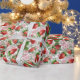 Red strawberries and pink roses create a vibrant, beautiful pattern on wrapping paper. Great for any special occasion.
