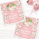 A cute and girly Berry First 1st birthday party napkin, perfect for adding a sweet touch to your celebration. This design features a watercolor pink strawberry pattern with green leaves around the edges. A large soft pink stripe runs down the centre, with Kid's Name BERRY FIRST Birthday in white, along with space to add a photo of the birthday girl, making it a unique and personal keepsake.