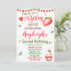 Invite your friends for a berry sweet celebration with this red and green strawberry invitation.