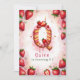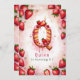 Celebrate a special birthday with this delightful strawberry letter "Q" cake invitation! This charming watercolor design features a fun and festive cake shaped as the letter "Q" decorated with fresh strawberries, pink icing, and a glowing birthday candle. The soft pink background with scattered strawberries adds a playful touch. Personalise with your child’s name, age, and party details for a one-of-a-kind strawberry-themed birthday celebration. Perfect for kids who love fruit-themed parties or summer birthdays!