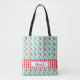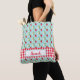 This fun, versatile tote bag features a sky blue background with luscious red strawberries and white blossoms all over it. The bottom has a red gingham check border accent. You personalise it with your name at the bottom.