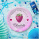 CUTE CHILDREN GIRL BIRTHDAY PARTY WITH STRAWBERRY AND HEARTS ON PINK WITH CIRCLES BACKGROUND.