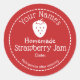 These customisable round stickers used as jam jar labels are perfect for your home canning, preserving, pickles, jams, jellies, and other homemade kitchen magic. They have an image of a white strawberry on a red background and say Your Name's Homemade Strawberry Jam.