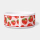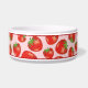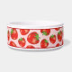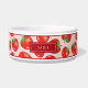 Fruity pattern of red and green colour strawberries together with a personalizable text area for a name or other custom text such as "food" or "water", for example. The background colour is light pink and the top and bottom have red colour borders. This playful pattern of strawberries is great for pet owners whose pet's name resembles the word: "Strawberry" or simply "Berry", for example. It is also a fun design for the summer time or for anyone looking to add a pop of red colour to their space. The combination of the colours red, pink and green flow well together and make this design a true treat to look at.