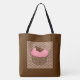 Printed tote - Strawberry Pink Frosted Cupcake topped with a chocolate butterfly in a decorative, chocolate brown damask patterned cupcake wrapper, on a brown, tan and coral pink Chinese scalloped background