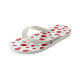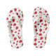 Kid's flip flops in red and white with a strawberry pattern with the fruit in various sizes.