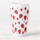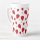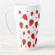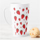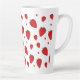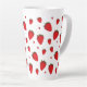 A latte mug with a strawberry pattern with the fruit in various sizes in red and white.