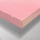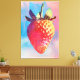 This image is a vibrant, colourful risograph print of a strawberry, featuring a blend of pink, blue, and yellow hues. The artwork has a stylised, almost pop-art aesthetic with dynamic, abstract background elements.