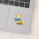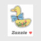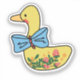 This custom cut sticker features a yellow duck lady wearing a blue huge bow tie on her neck and strawberry pattern on her belly