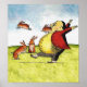 Here we have a portly gentleman with a receding hairline, wearing a red jacket with gold buttons and plaid pants, his arms flailing backwards and one leg in the air. A brown rabbit is emerging from his open mouth, while two other rabbits sit on the grass and another is leaping through the air. Silly illustration by Edward Lear on the cover of "The Complete Book of Nonsense and Other Verse". Edward Lear (12 May 1812 – 29 January 1888) was an English artist, illustrator, author and poet , known principally for his popular nonsense works, which use real and invented English words.