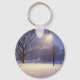 Panoramic view of evening winter landscape. View of covered in snow trees in park and street lights in Riga, Latvia.