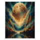 This digital artwork portrays a surreal and enchanting scene, where a massive, textured planet dominates the sky, casting a warm, golden glow over a tranquil forest landscape. The planet, with its intricate surface patterns, appears to be floating above a calm lake, reflecting its light and colors in the water below. Tall pine trees stand on rocky shores, their silhouettes adding depth to the composition. The sky is filled with swirling patterns of teal, gold, and deep blue, creating a sense of movement and energy. The interplay of light and shadow, combined with the reflective surface of the lake, evokes a sense of wonder, peace, and the beauty of the cosmos. This image captures the harmony between nature and the universe, inviting viewers to contemplate the vastness and mystery of the cosmos.