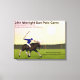 A polo player riding a moose (Alces alces), mallet raised to strike. The sun hangs low over the surrounding conifer forest. Text reading, "25 Midnight Sun Polo Game", "Sponsored by the North Star Polo Club", "Sunday at the Fairbanks Polo Grounds" and "Begins promptly at midnight Mosquitos and kinds under eight get in free" also appears.