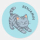 Stretching Grey Tabby Cat Blue Custom Name Classic Round Sticker
