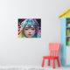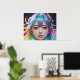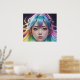 A digital character with luminous, multi-coloured hair and mechanised headgear gazes directly at the viewer with striking, large eyes. The background is dark, which emphasises the vibrant colours of the hair and the futuristic elements of the headgear.