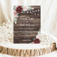 Allow your guests to feel the rustic charm of your wedding with this burgundy and blush pink floral wedding invitation. The background features a barn wood look with string lights and a bouquet of roses and eucalyptus, giving the invitation country charm. This sweet and romantic invitation is perfect for a rustic outdoor wedding and will leave your loved ones eager to join you for your special day.
