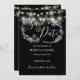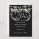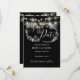 A stylish black and white save-the-date card featuring pretty string lights and delicate floral illustrations on a black background. Personalise with your special save-the-date information. Designed by Thisisnotme©