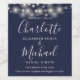Featuring pretty string lights and chic signature style names, this elegant navy blue wedding wine label can be personalised with your information in elegant lettering. Designed by Thisisnotme©