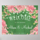 Chic and classy wedding sign poster with rustic pink peony roses and twinkle strings of lights on emerald green wood background. Ideal for your spring summer | garden | outdoor backyard | country rustic themed wedding.