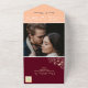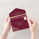 Elegant, rustic, boho, modern, chic peach fuzz and burgundy wedding all-in-one invitation with faux gold floral lace, string lights and custom picture of the couple at the back.