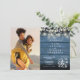 A stylish wedding invitation featuring your special photo and pretty sage and lilac leaves, string lights, mason jars and your wedding details set in elegant text on a blue rustic wood background. Designed by Thisisnotme©